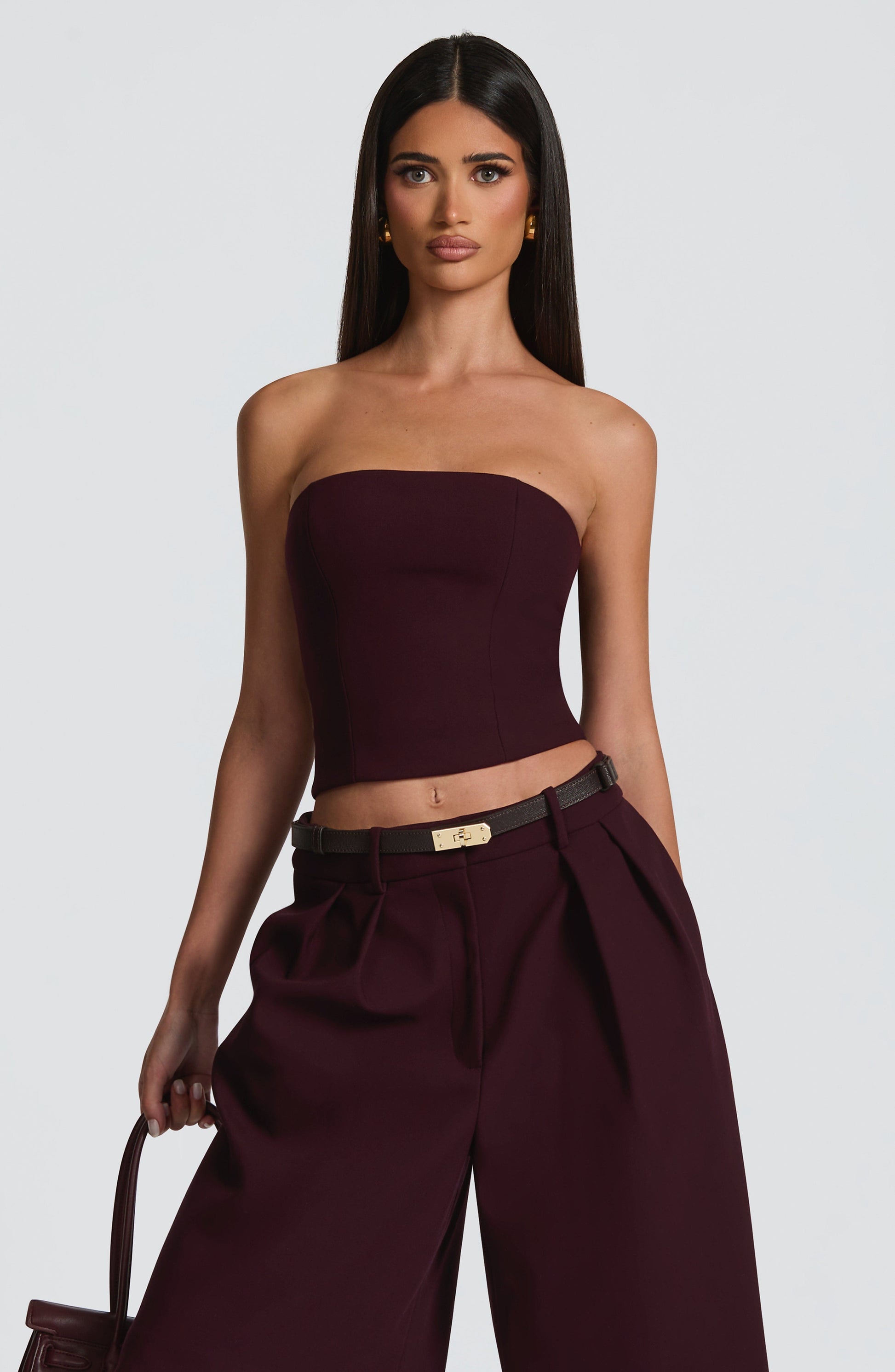 The Kerry Top in rich plum features a strapless design crafted from non-stretch woven suiting fabric. Its lace-up back adds a refined, adjustable fit, perfect for elevating your sophisticated wardrobe.