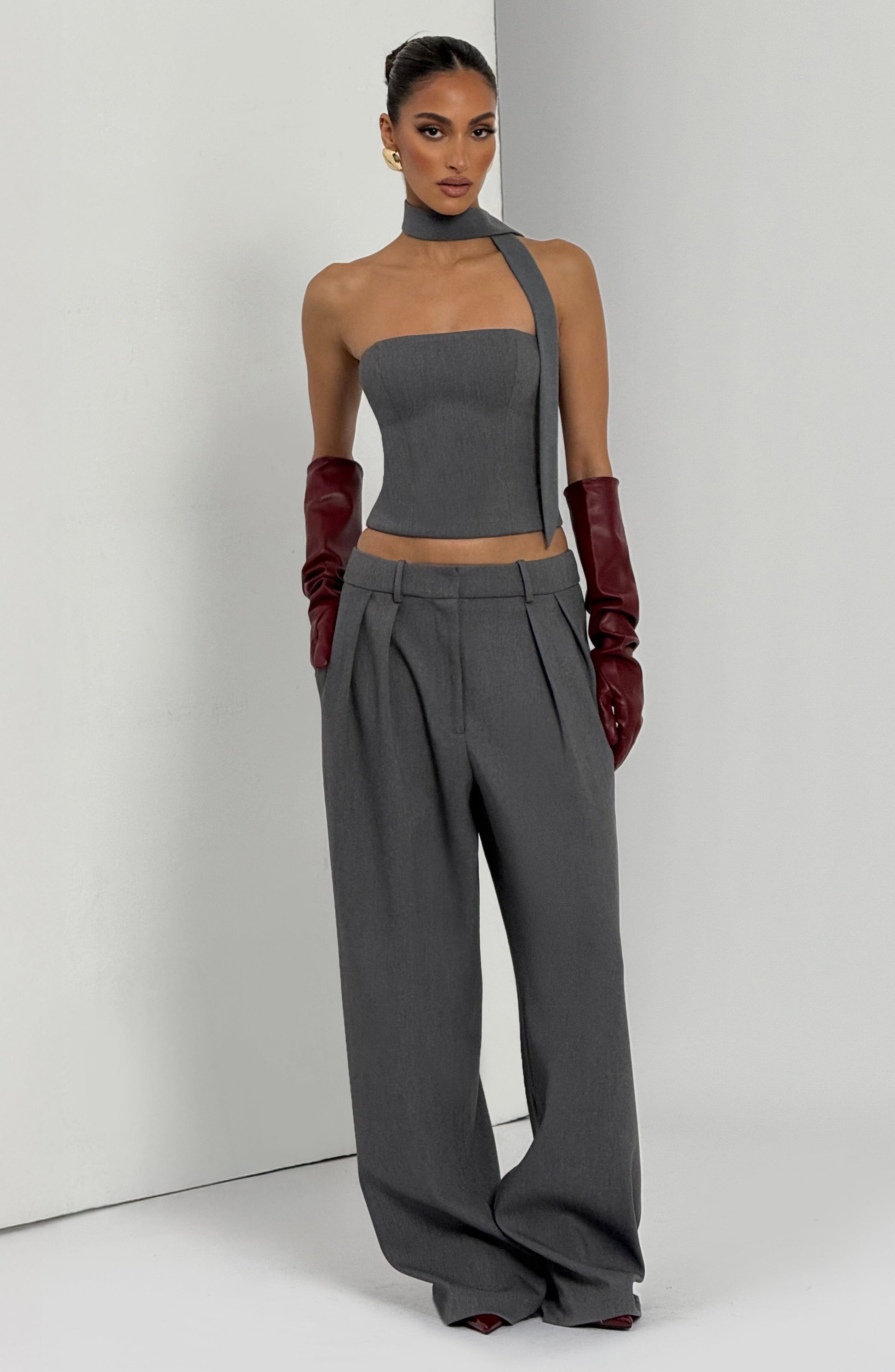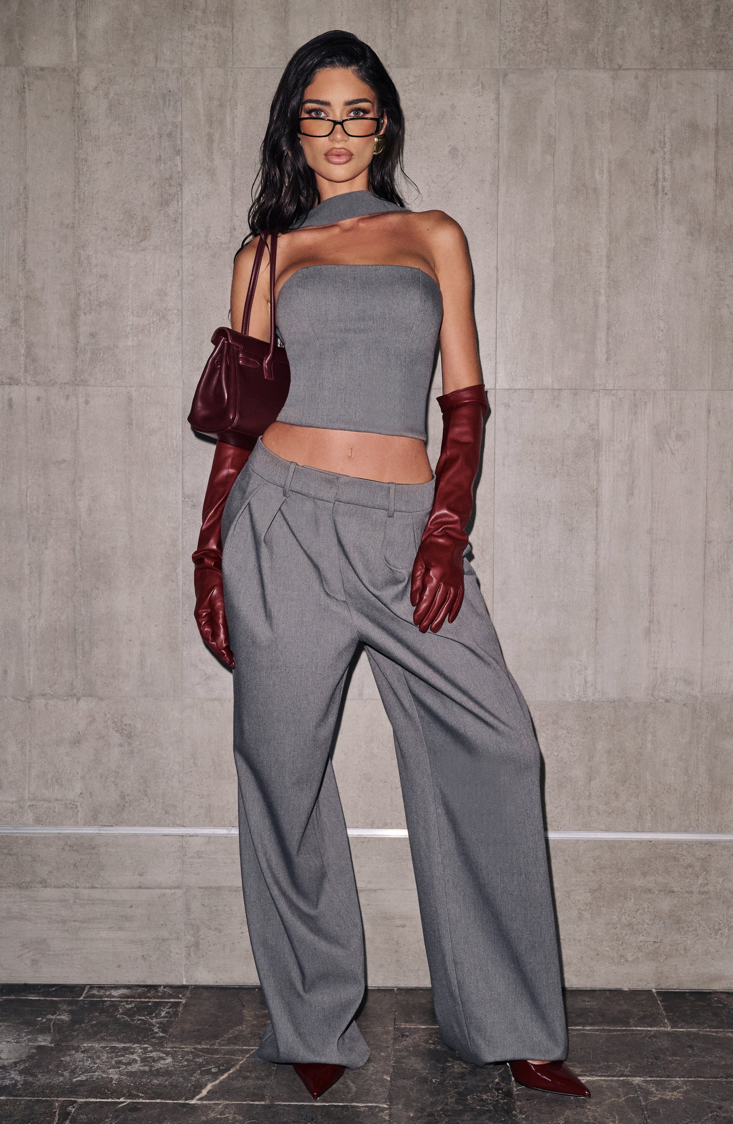 Crafted from grey marl non-stretch woven suiting fabric, the Kirsty Pants feature a refined mid-rise fit with a wide leg silhouette. Attention to detail is evident in the double pleats and twin welt back pockets, complemented by a discreet fly zip closure for a sleek finish.