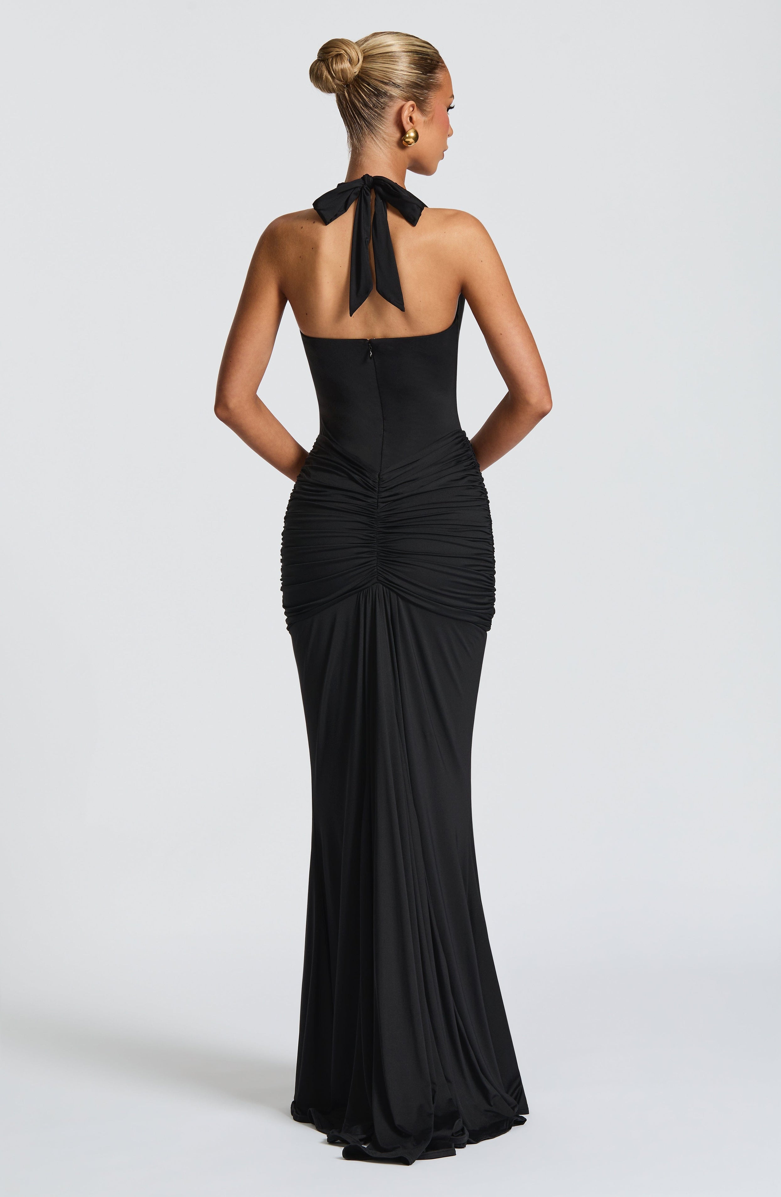 Turn heads in the Rosetta Maxi Dress. With its slinky jersey fabric and dramatic silhouette, this dress is both comfortable and stunning. The plunging halter neckline and ruched details add a touch of elegance, while the full skirt with train and draped panel make a dramatic impact. Be the center of attention in this black beauty.