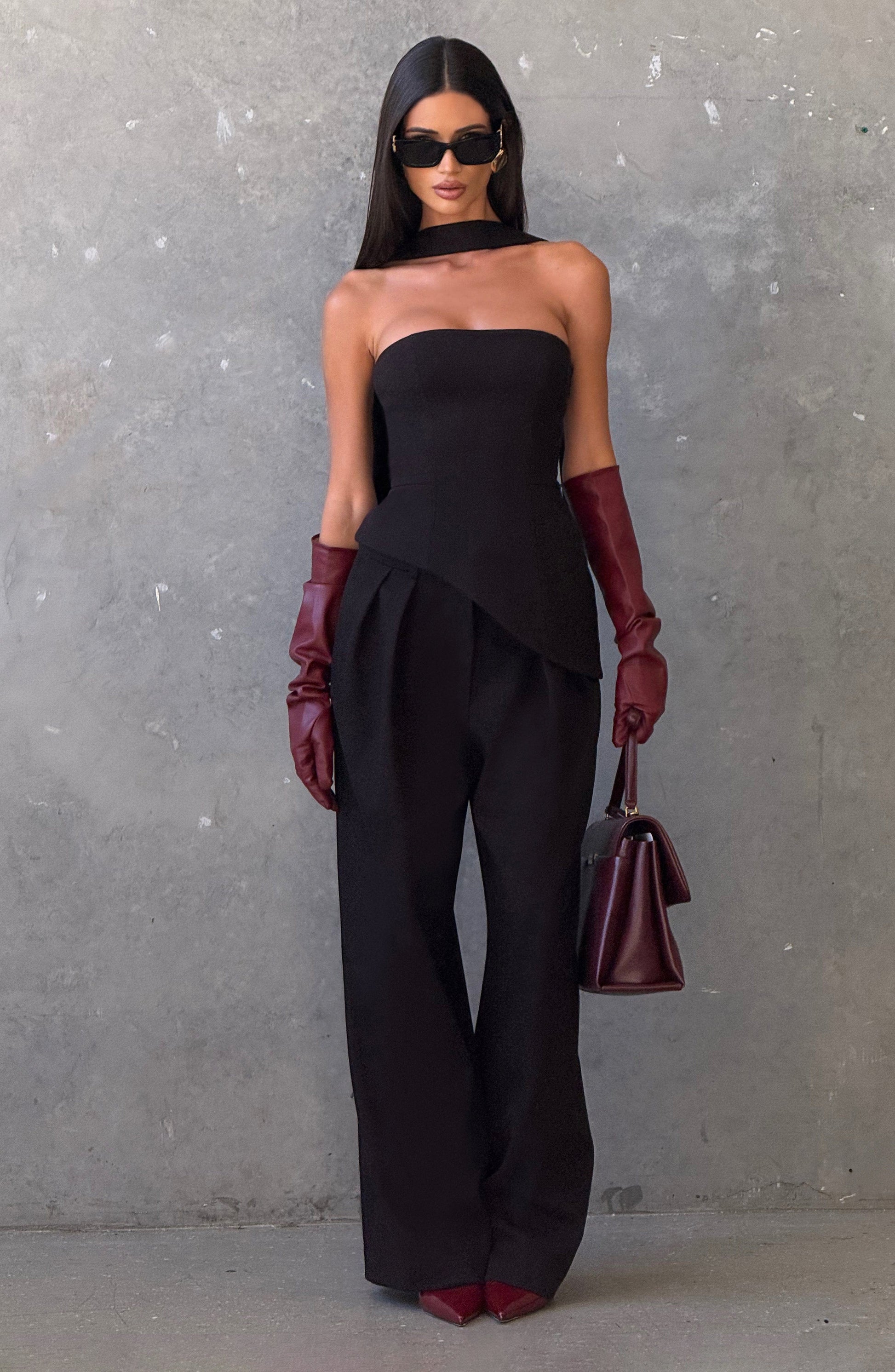 The Sloan Top in black features a strapless, fitted longline bodice crafted from structured non-stretch woven suiting fabric. Its asymmetric curved hem and lace-up back detail add refined elegance and a tailored finish.