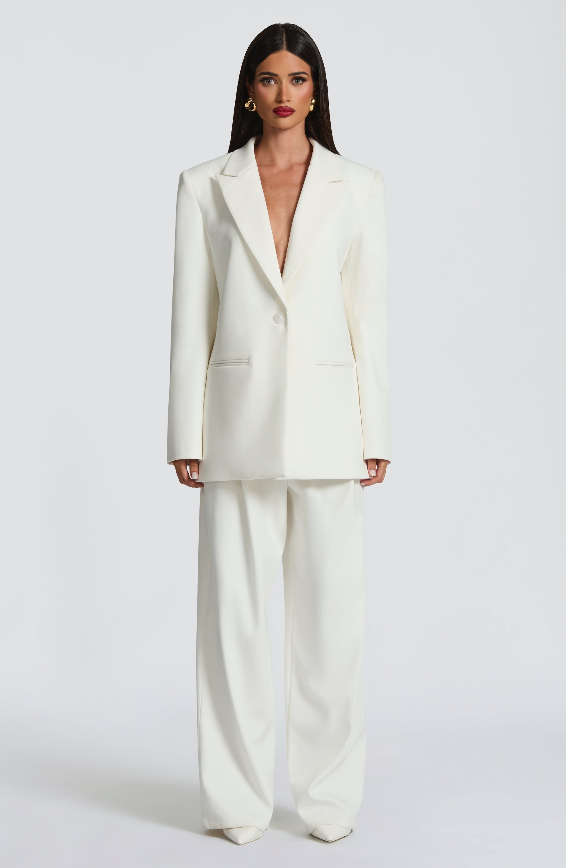 The Reece Blazer in Ivory features a refined non-stretch woven suiting fabric with a notched lapel collar and an oversized, boxy silhouette. Designed with a single button closure and twin double welt pockets, it offers timeless elegance with a modern edge.