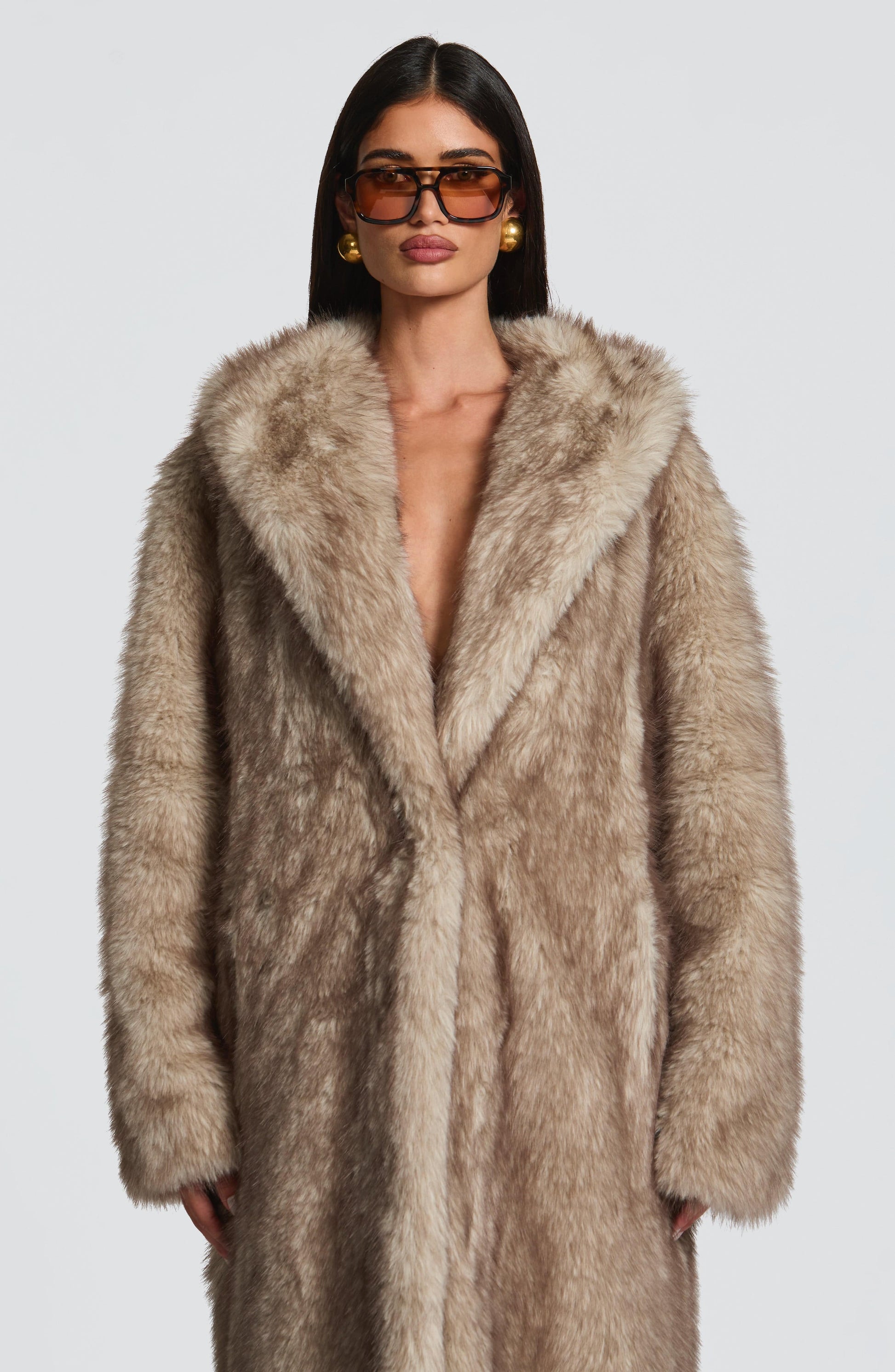 Elevate your winter wardrobe with the Willow Coat in beige. Crafted from soft, two-tone faux fur with a luxurious long pile, this full-length coat features a wide shawl collar and an oversized fit, blending warmth with effortless sophistication.