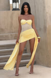 The Fiorella Mini Dress in lemon combines stretch jersey and sheer mesh for a sleek, strapless silhouette with a twisted sweetheart neckline and asymmetric hem.