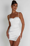 Mabel is our must-have mini this season. Cut from luxurious stretch satin, the minimal yet chic Mabel has a flattering halter neckline and underwired cups to frame your bust, finished with a thigh high split. Wear yours with barely there mules for a party or special occasion.
