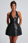 Missy makes a statement, our brand new faux leather mini with a plunge V halterneck and panelled bodice for a super snatched waist. The bubble shape skirt has internal boning for added shape. Wear with all black heels and bag.