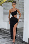 Take in all of the divine details of Rachelle maxi, cut from our premium high shine fabric that's double layered for a cinched-from-within fit. This gorgeous design features one shoulder detailing, flattering cut out and thigh high split.