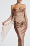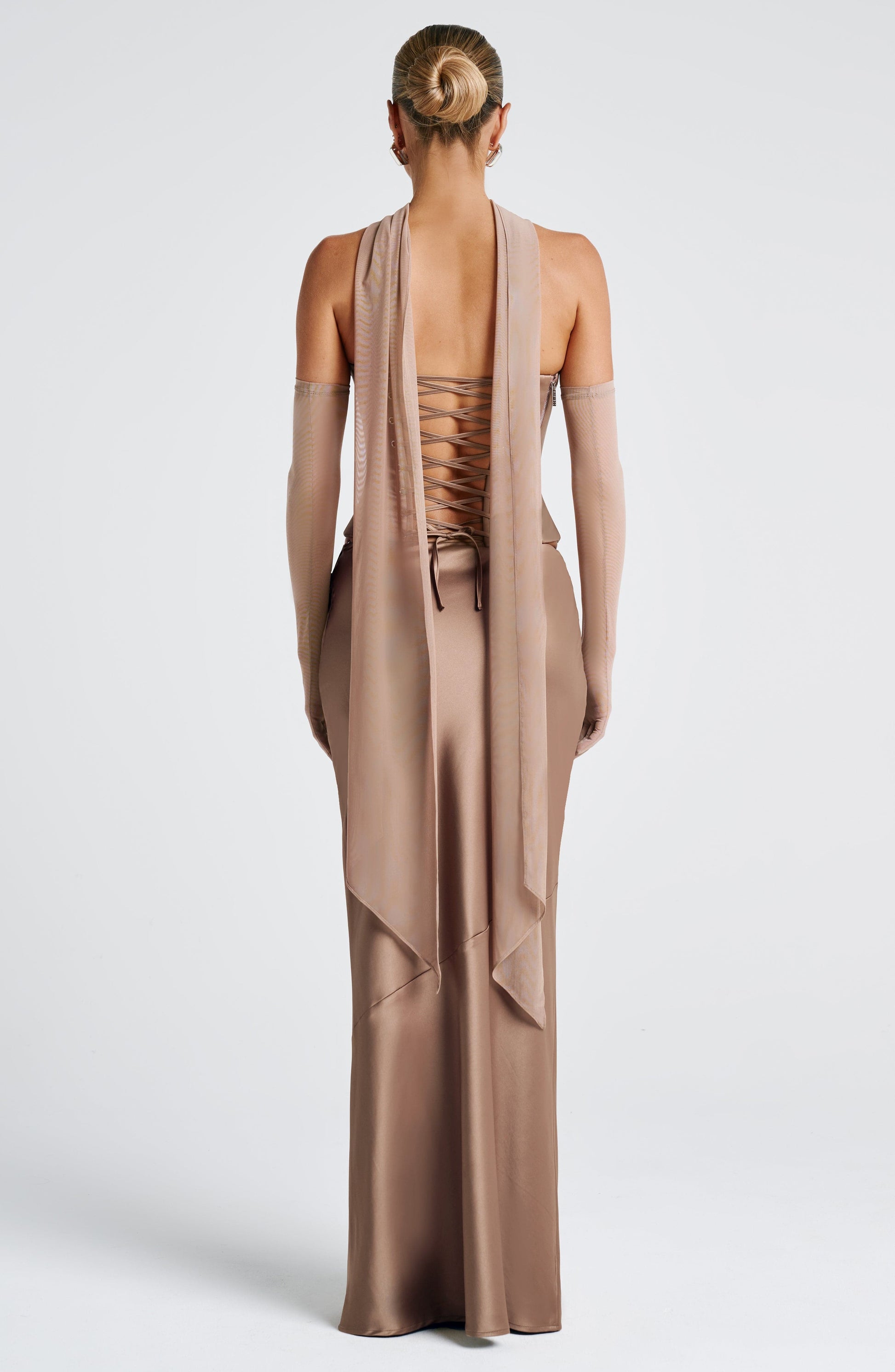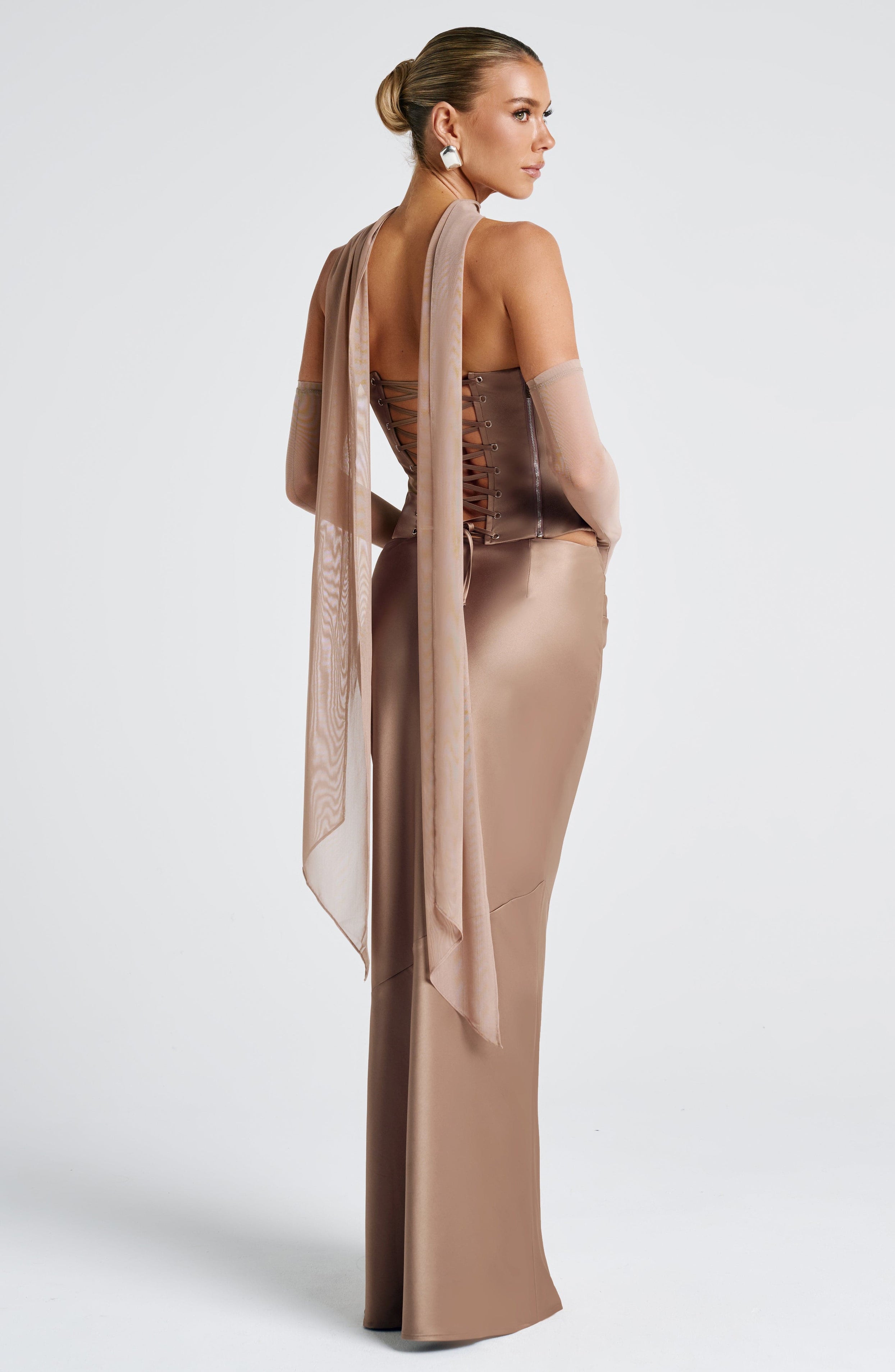 The Ayla Mesh Scarf in Hazel is the accessory of the season, offering a sophisticated touch to any look. Made from light stretch mesh, this scarf drapes elegantly over the neck, adding a soft, textured layer of style. Pair it with the Callista Corset, Bernadette Maxi Skirt and Eli Gloves for an effortlessly refined look.