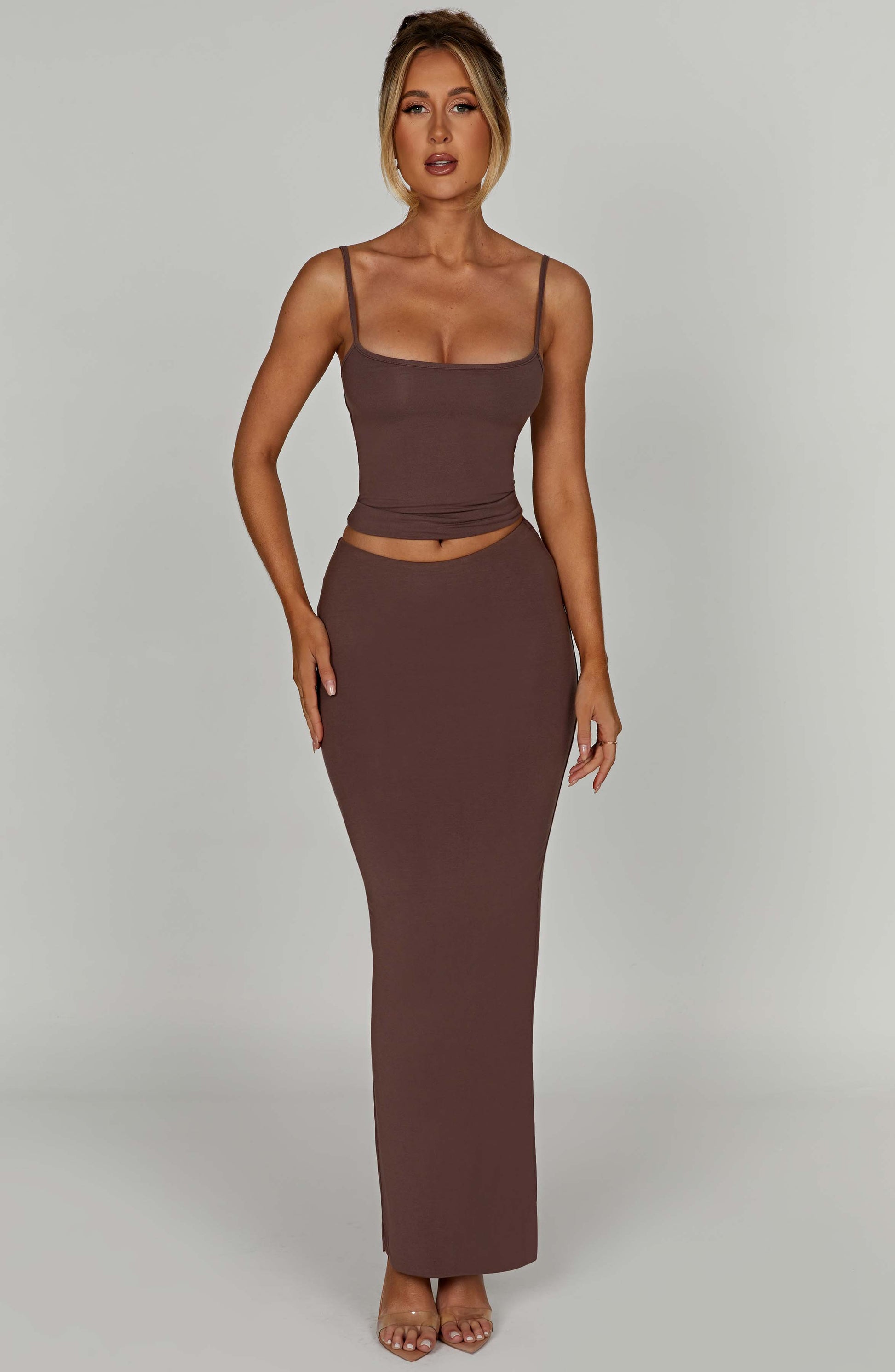 Double lined with a buttery soft, second skin feel, our brand new Yasmin maxi skirt is one to wear on repeat. Serving stretch and snapping back to shape to contour your body, this mid rise design couldn't be more flattering, falling just below your waist. Pair with the Anika crop top for the basic look of your dreams.