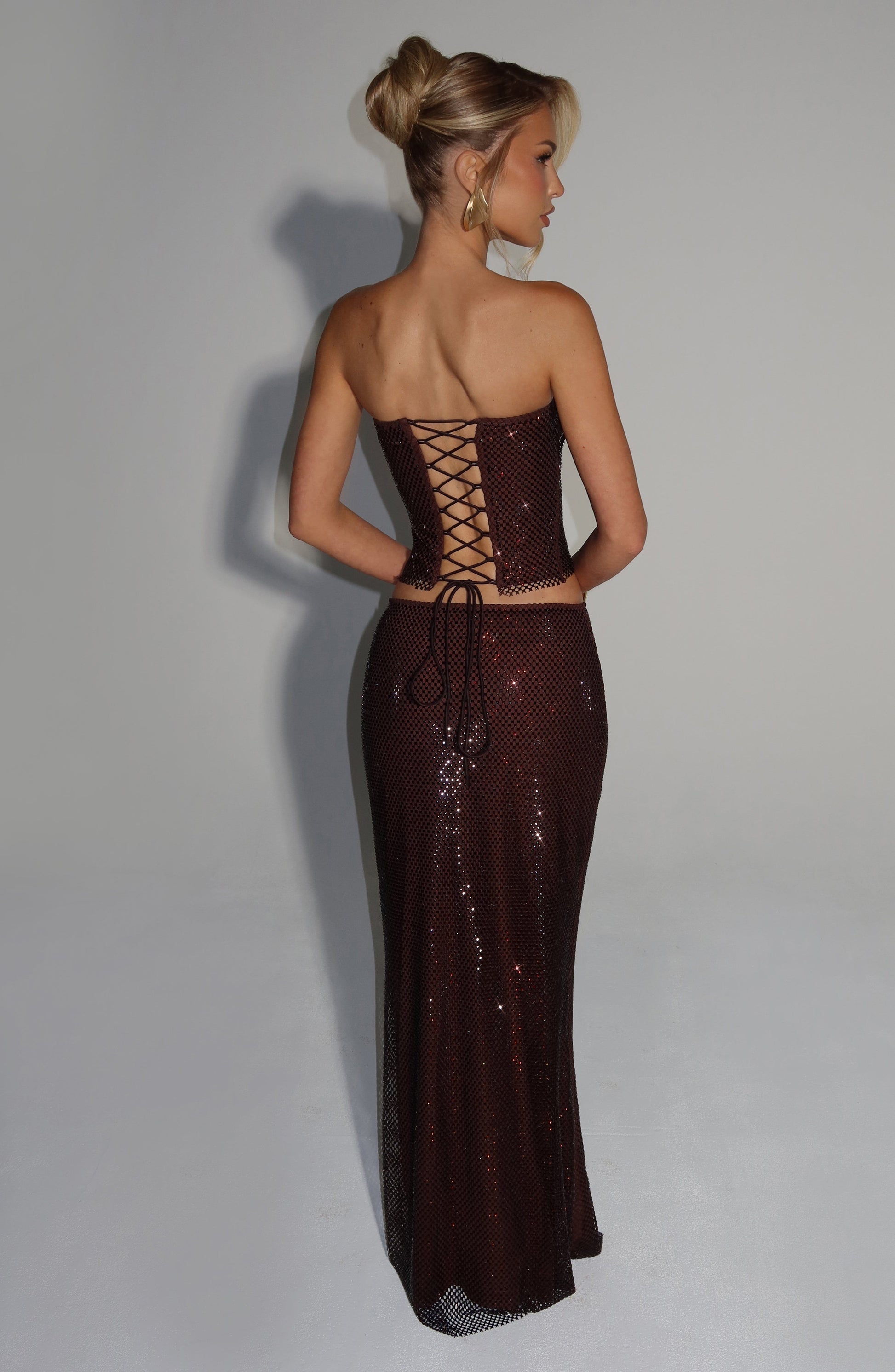 The Serena Top in plum brown features a strapless neckline and a delicate stretch net fabric. Adorned with square hotfix rhinestones, it offers subtle sparkle, while the lace-up back with satin ties ensures a refined, adjustable fit. Perfect for elegant occasions.