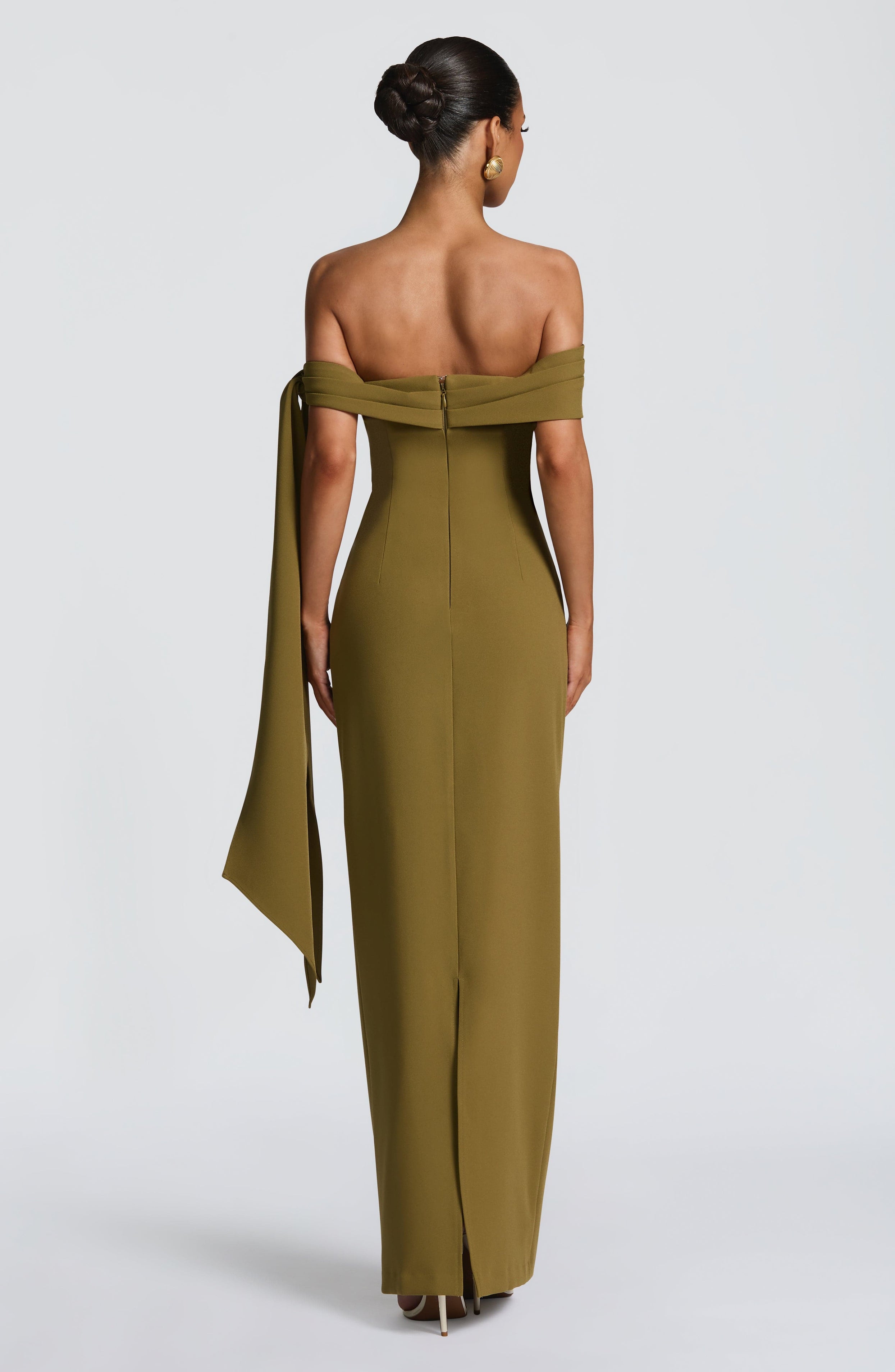 The Addie Maxi Dress in deep olive features a non-stretch crepe fabric with a pleated asymmetric bardot neckline, accented by a draped knot and tie detail. Its column-shaped skirt with asymmetric waist pleating and a center back split.