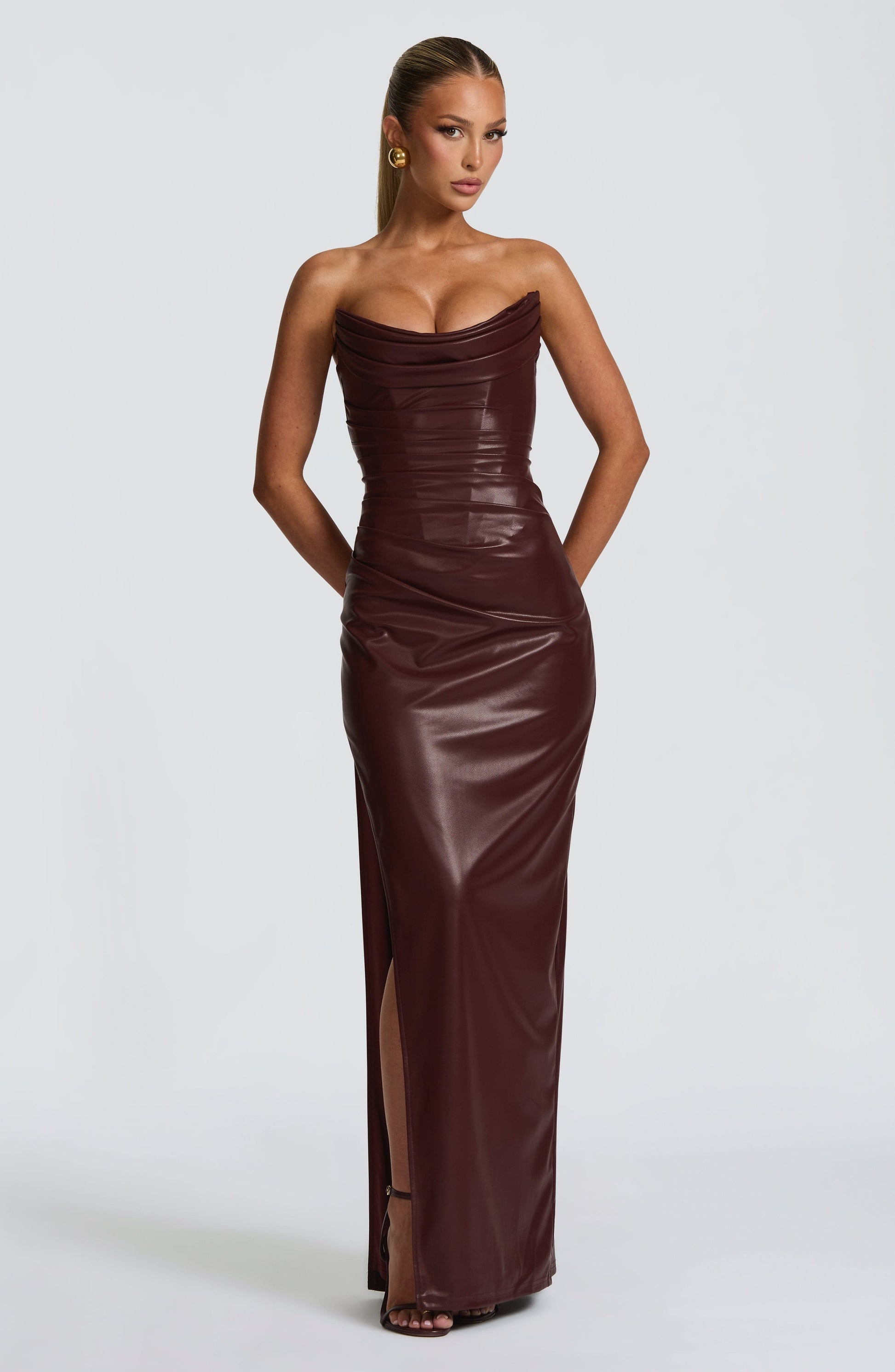 The Alba Maxi Dress in rich burgundy features a scooped neckline with elegant pleated cowl and an internal boned bodice for structure. Asymmetric pleating enhances the fitted silhouette, flowing into a column skirt with a daring thigh-high split for refined allure.