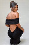 Whether it's date night or girls night, capture all attention in the Belinda maxi dress. Made in super smooth, slinky fabric that moulds to your body, this double layered design features an off the shoulder, bardot neckline that's gathered. It's complete with an open low back with ruched detailing. Looks amazing paired with tonal heels and gold jewellery.