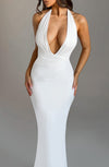 All eyes, on you! Say yes to every party, event and occasion this season in the Evangeline maxi, a sexy, slinky design made in premium jersey to flatter your curves. This plunge neck dress has halter straps which tie at the back, pleat detailing to the bust and waist and a showstopping low v-back with ruched detailing on the bum. Wear with a messy hair up and minimal jewellery.