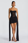 The Fiorella Mini Dress in black features a strapless sweetheart neckline, sheer mesh waist, and asymmetric hem. Its bodycon fit and ruched hip panels create a sleek, elegant silhouette without zippers.