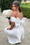 Introducing the dreamiest dress to say 'I do' in. Joanna is cut from our luxe stretch crepe that hugs the figure and flares gently at the skirt. It has a pleated satin bardot panel neckline with stunning removable bow to the reverse. It's complete with pleats to the waist.
