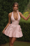 Get ready to turn heads in the Jocelyn Mini Dress in Soft Peach! Featuring a plunging, halter neckline and structured, floral jacquard fabric for a flattering fit. The lace up back and underwired cups add a touch of edginess, while the full skirt and pleated godet panels on the hips create a playful silhouette. Plus two pairs of detachable bows, both small and large to customise your look.