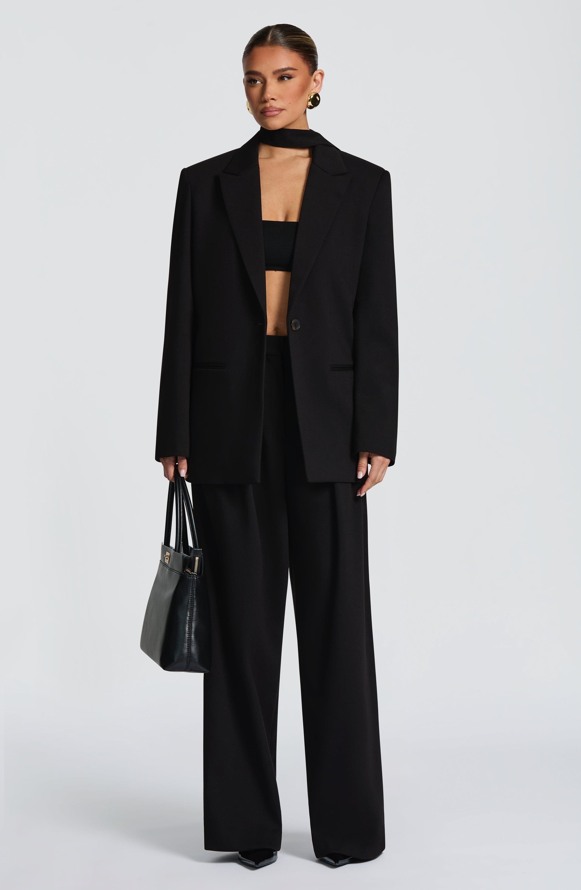 The Kirsty Pants in black offer a refined silhouette with their mid-rise, wide-leg cut. Crafted from non-stretch woven suiting fabric, they feature a double pleat detail and a fly zip closure for a polished finish. Twin welt pockets at the back add subtle sophistication.
