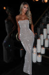 Indulge in the luxurious Neriah Maxi Dress in Nude. Crafted from premium stretch mesh fabric and fully lined, it boasts a strapless neckline and all-over embellishment with dazzling large square hotfix rhinestones. Featuring a body hugging fit and a centre back split, it exudes elegance and sophistication. A hidden zipper fastening adds to its exclusive design, making it the perfect choice for any special occasion.