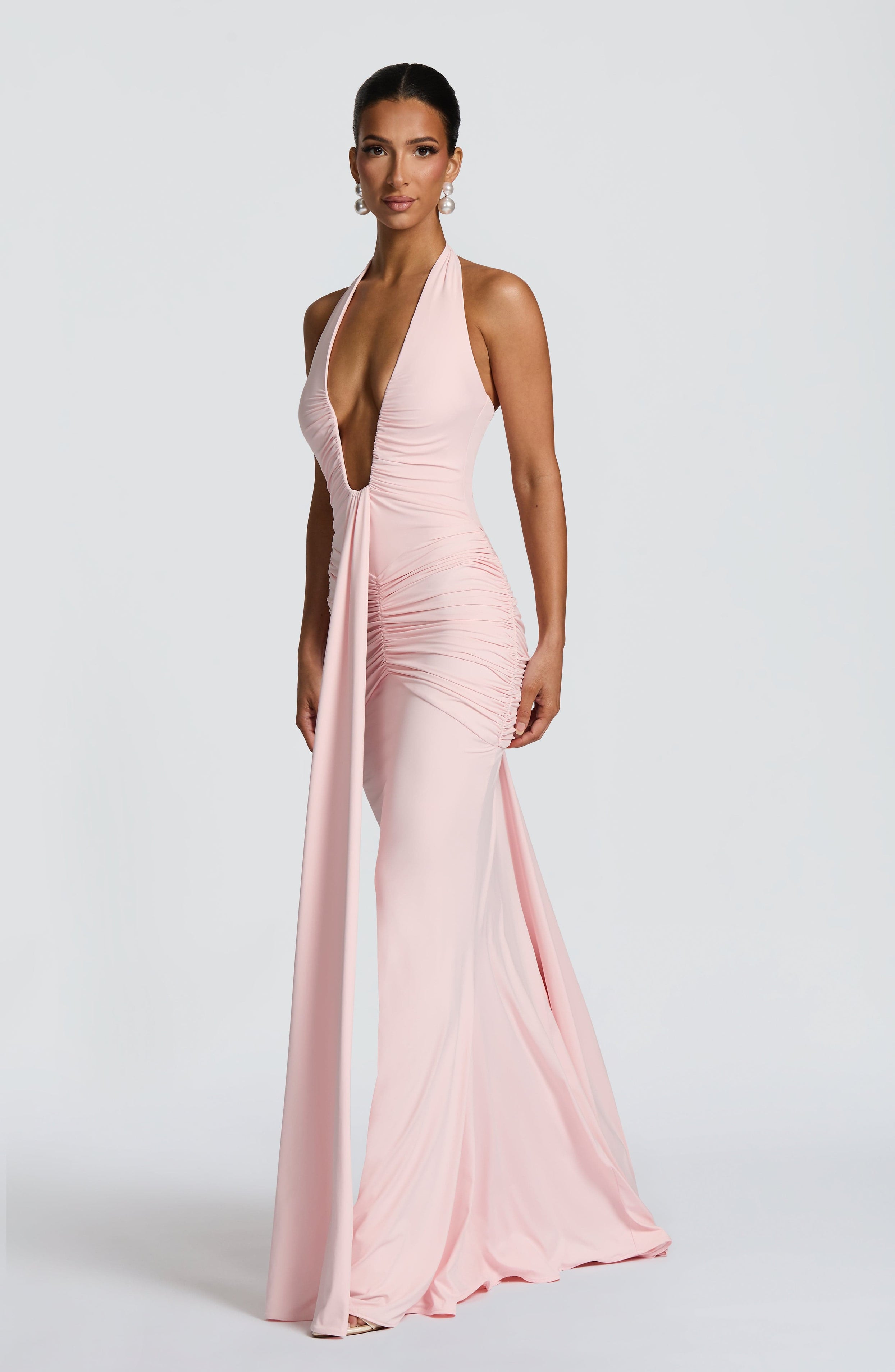 The Rosetta Maxi Dress in Blush features a slinky jersey fabric with a plunging halter neckline and gathering detail. A ruched panel accentuates the hips, leading to a full skirt with train and a long, draped center-front panel for an elegant, sophisticated look.