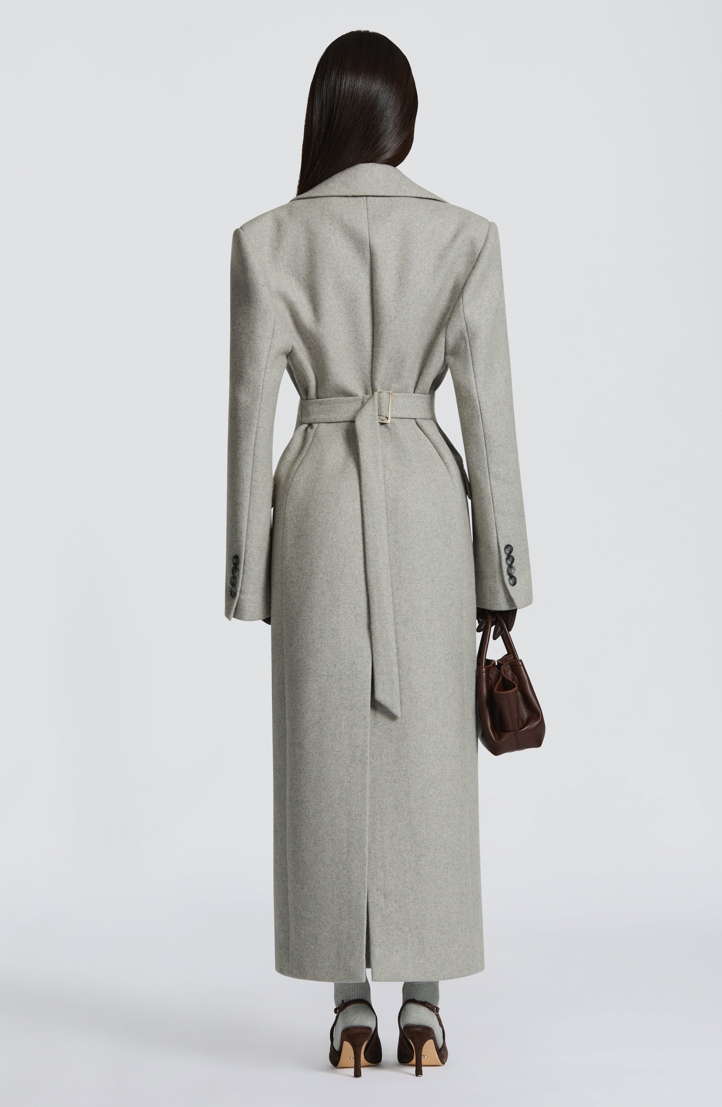 The Ursula Coat in light grey combines a refined wool blend with a full-length tailored silhouette. Featuring a notched collar with wide lapels, multi-button closure, and adjustable back waist strap, it offers an elegantly fitted shape. Angled welt pockets add subtle detail, perfect for a sophisticated, polished look.